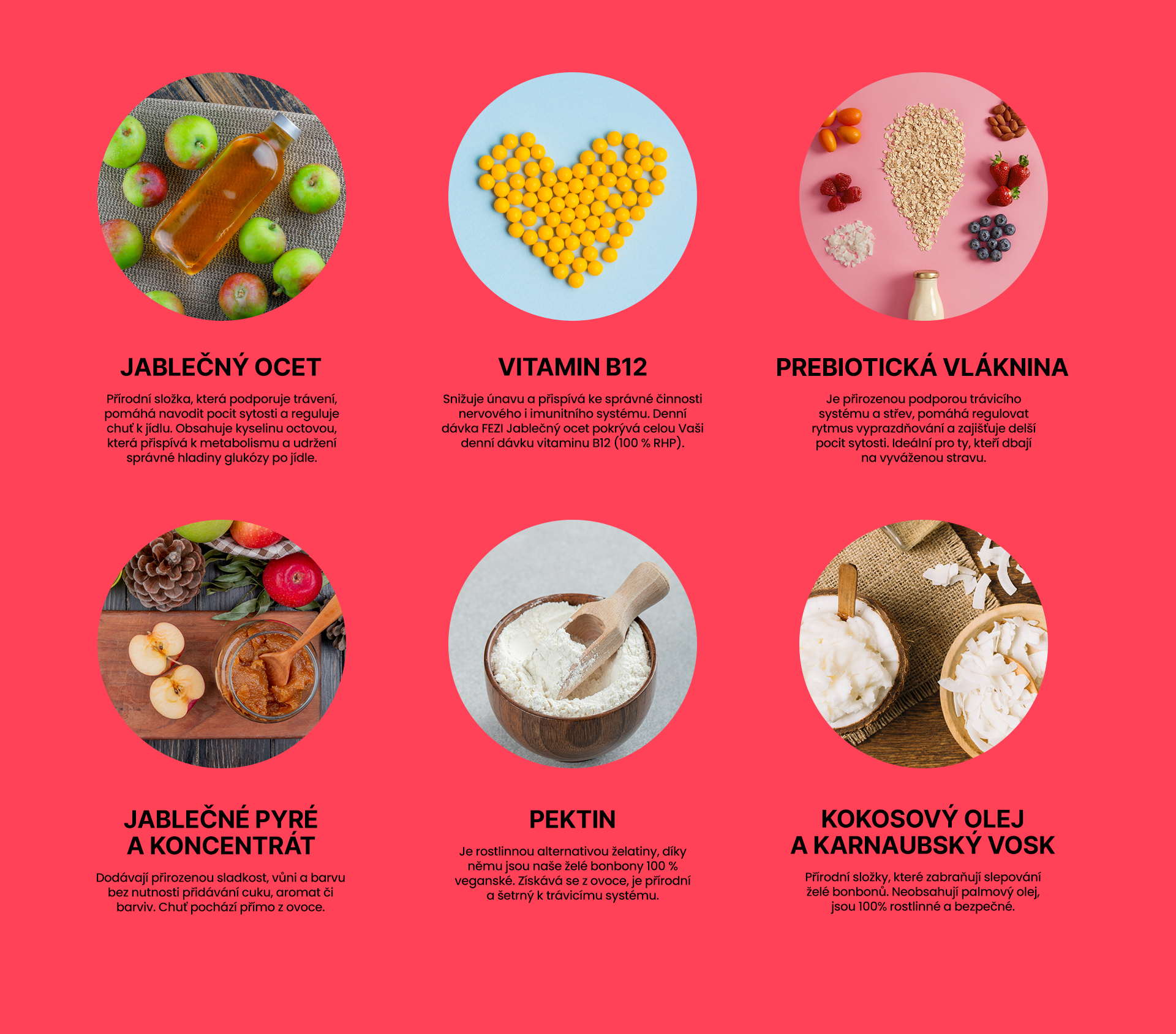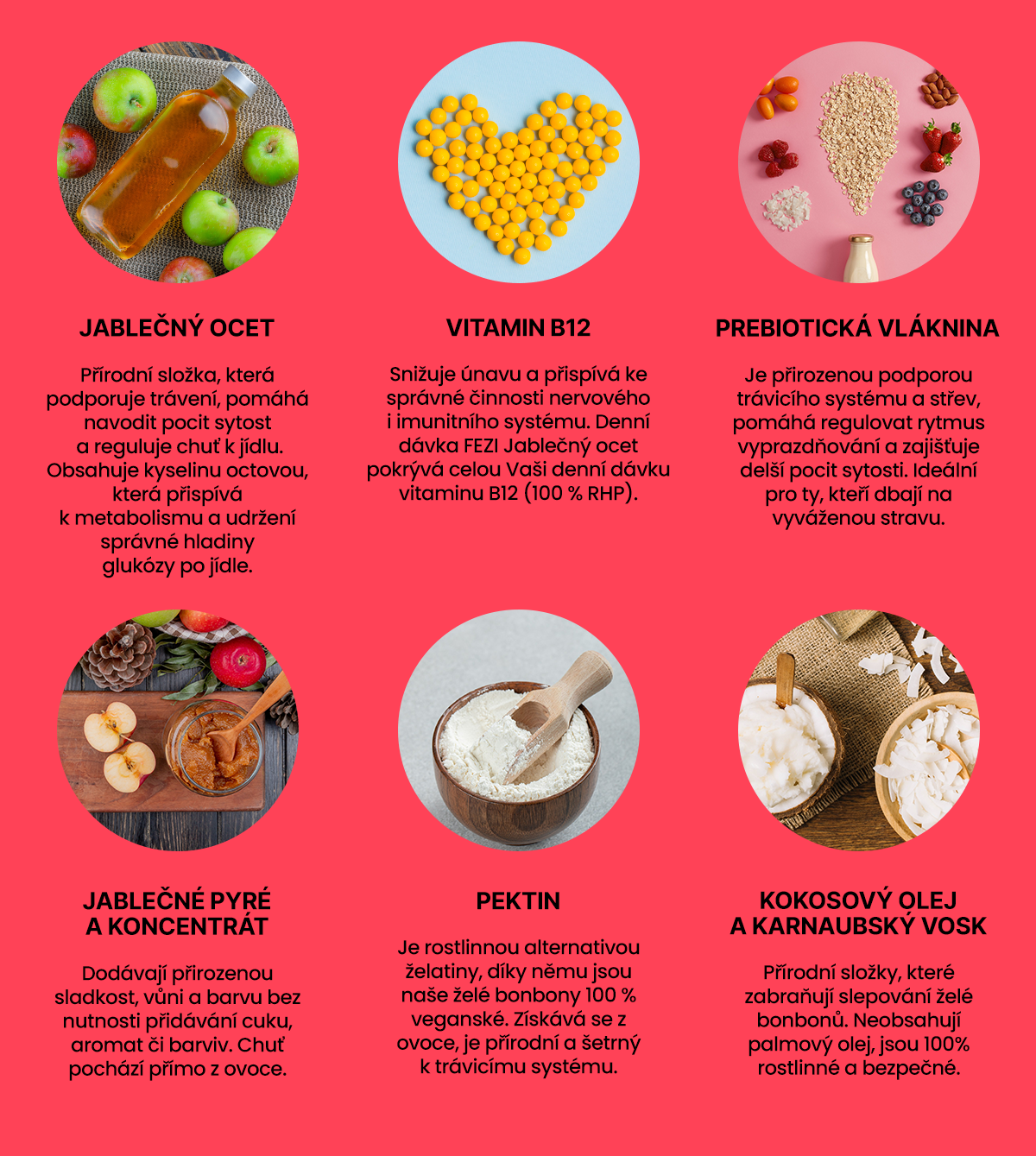 Složení: jablečné pyré, jablečný koncentrát, extrakt z jablečného octa 5 %, isomaltooligosacharidy, želírující látka: pektin, přírodní jablečné aroma, kyanokobalamin (vitamin B12), glazurovací látky: karnaubský vosk, kokosový olej.